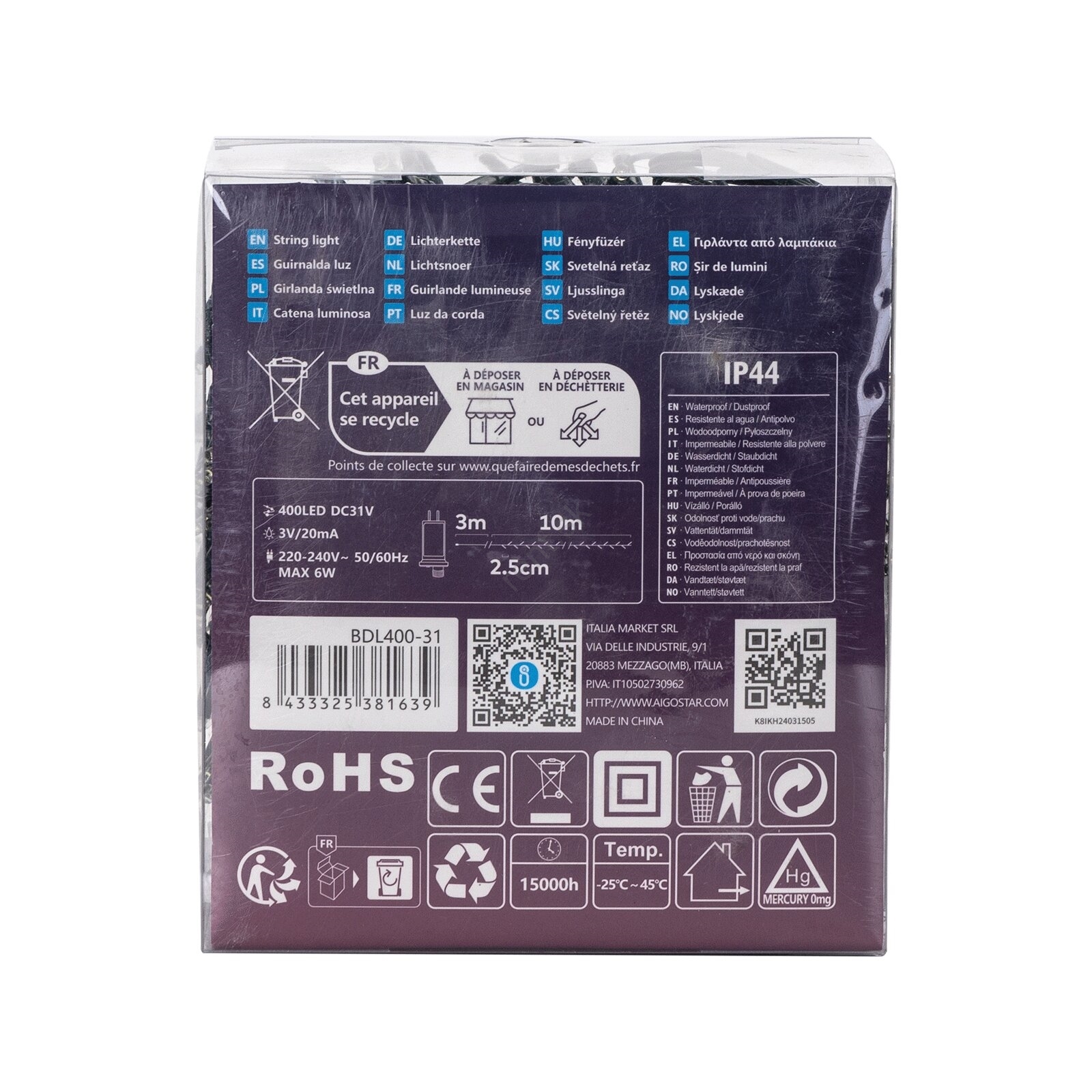 • Aigostar - LED vonkajší vianočný reťazec 400xLED/8 funkcií 13m IP44 studená biela