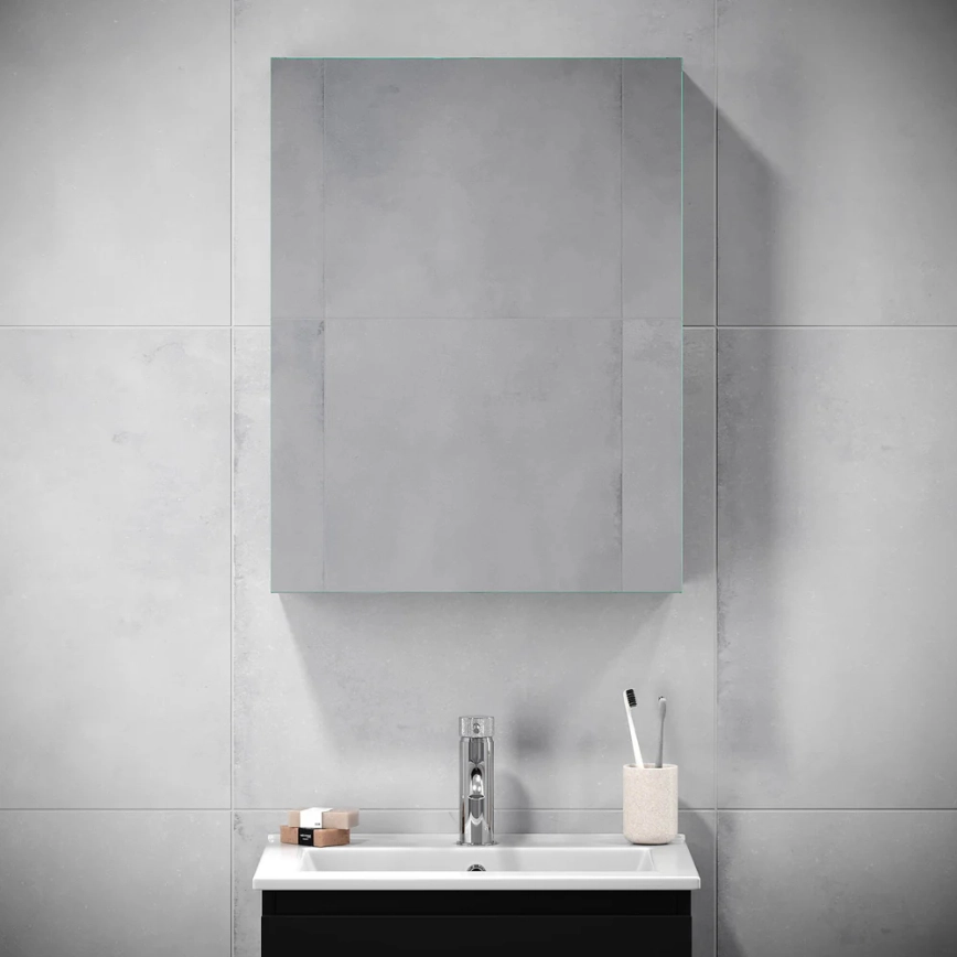 Skrinka má zrkadlové dvierka s tlmeným dovieraním.