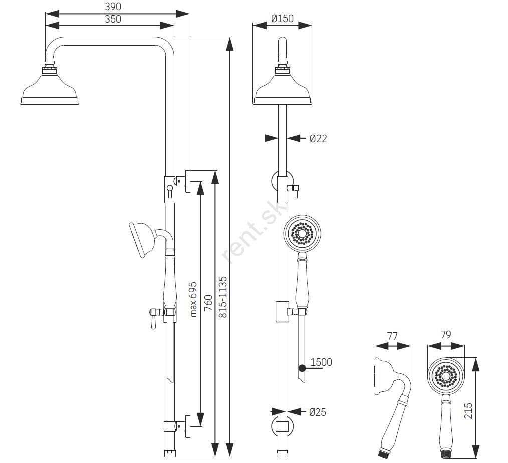 • Sprchová tyč a vrchná sprcha z nerezovej ocele s povrchovou úpravou PVD.