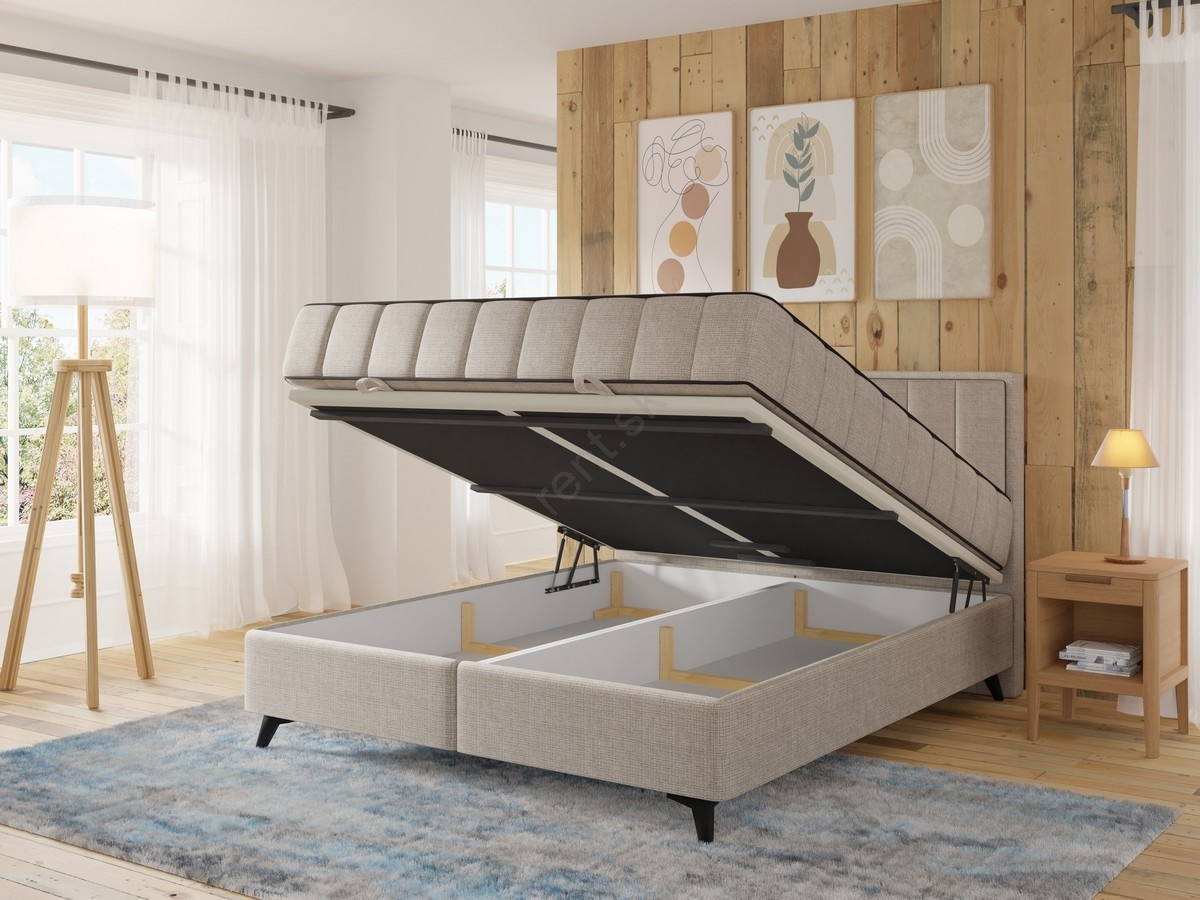 • Čalúnená dvojlôžková posteľ spája moderný štýl s praktickými funkciami.