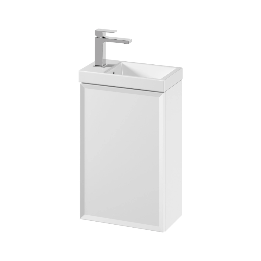 Závesná kúpeľňová skrinka sa dodáva vrátane keramického umývadla.