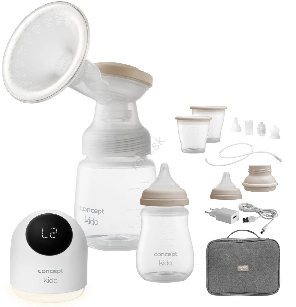 • Príslušenstvo: Motorová jednotka + 1 fľaštička 160 ml (cumlík veľ. S), 2x Zásobník na mlieko s viečkom, Nadstavec na odsávanie, Fľaštička 240 ml (cumlík veľ. M), Nosová odsávačka, Cestovný box, USB kábel, Adaptér do zásuvky.