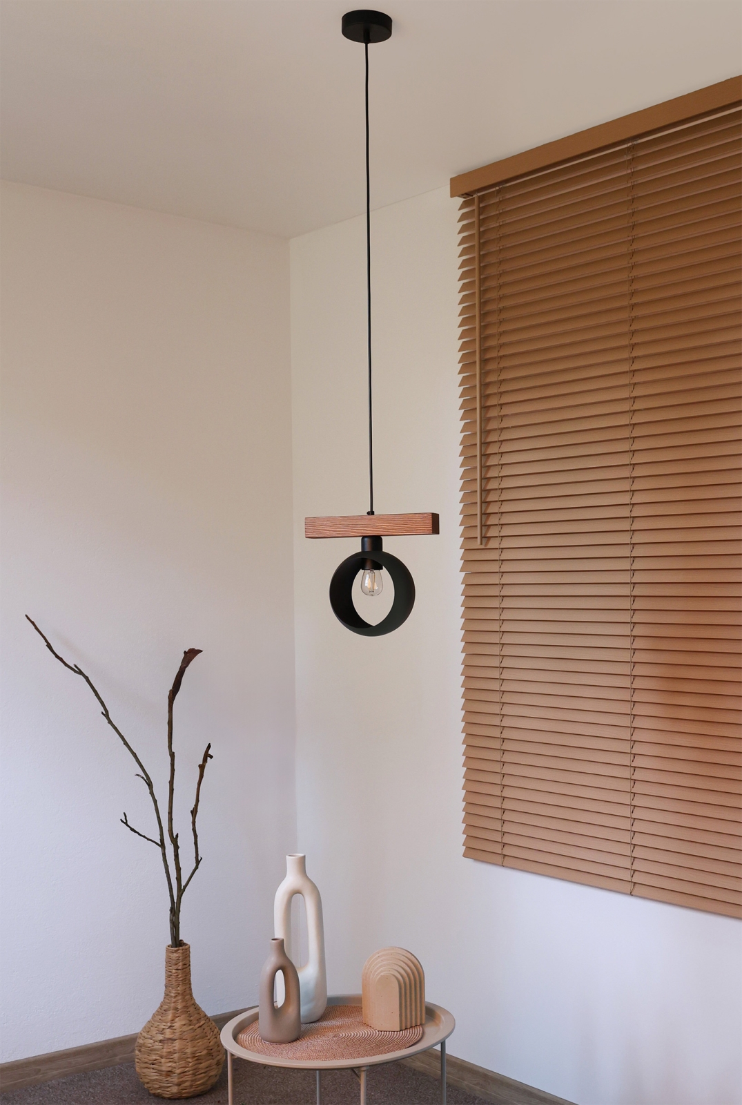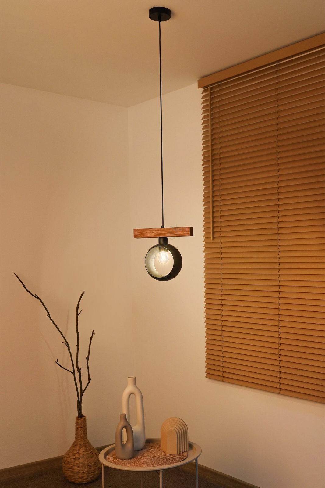 Svietidlo je vyrobené z kovu a kvalitného borovicového dreva.