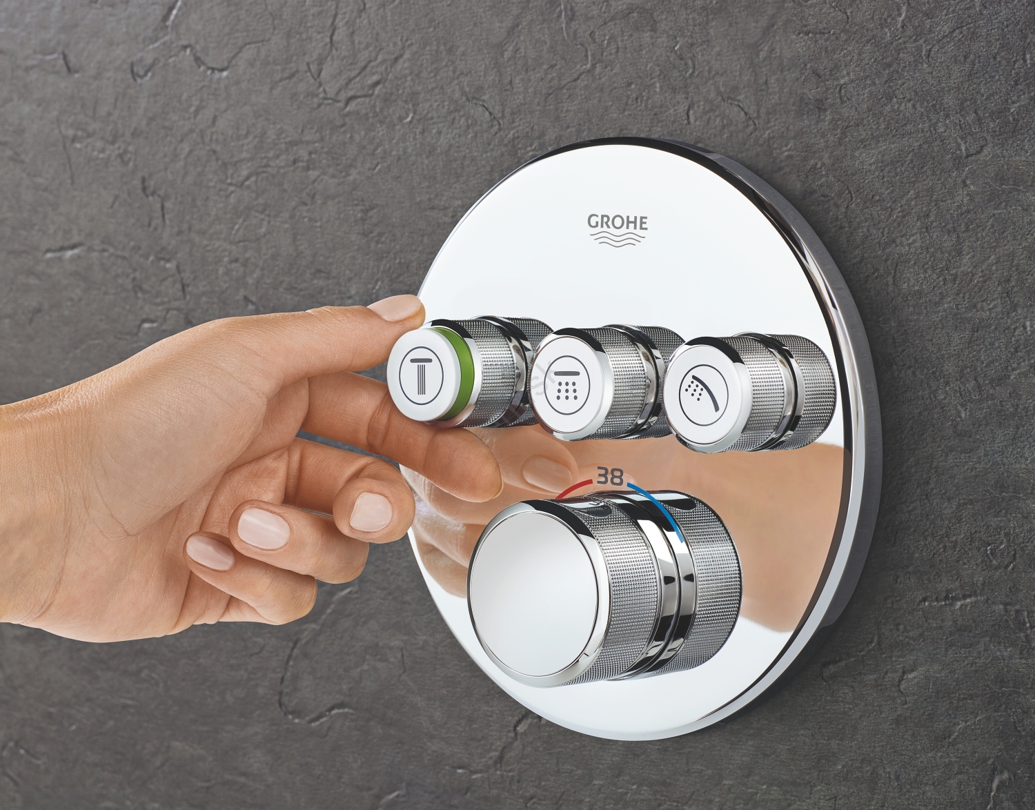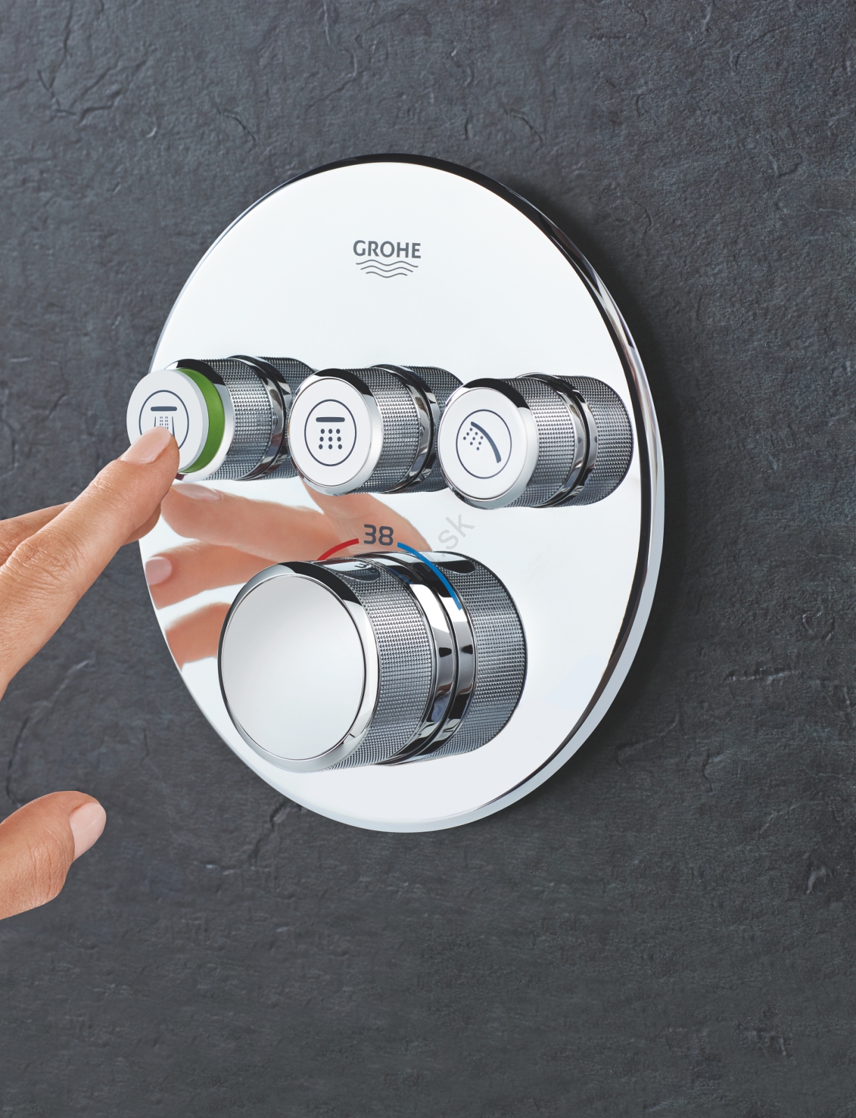 • Ovládanie GROHE SmartControl: stlačením zapnete/vypnete, otočením nastavíte prietok vody od úsporného režimu po plný prietok.
