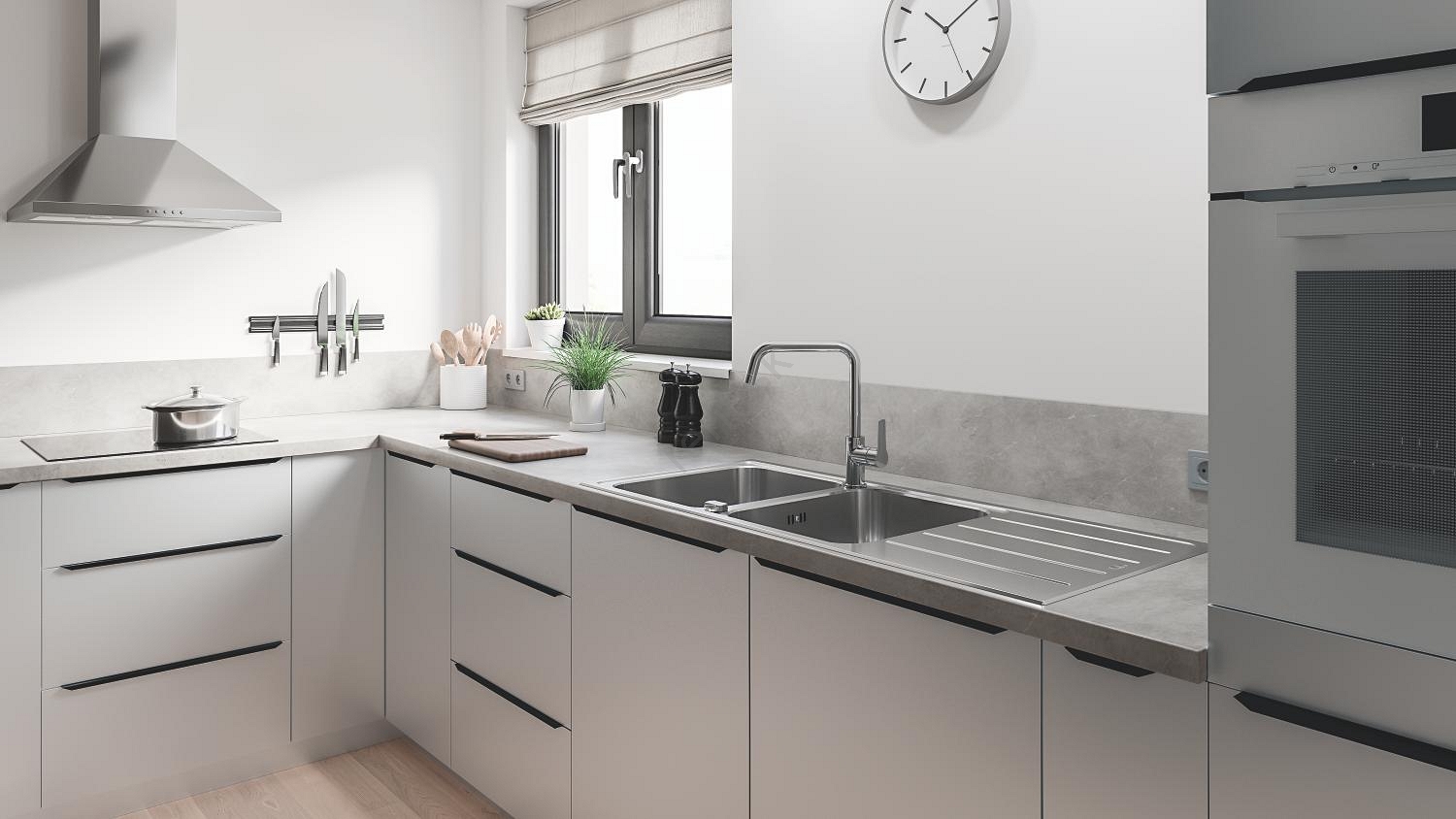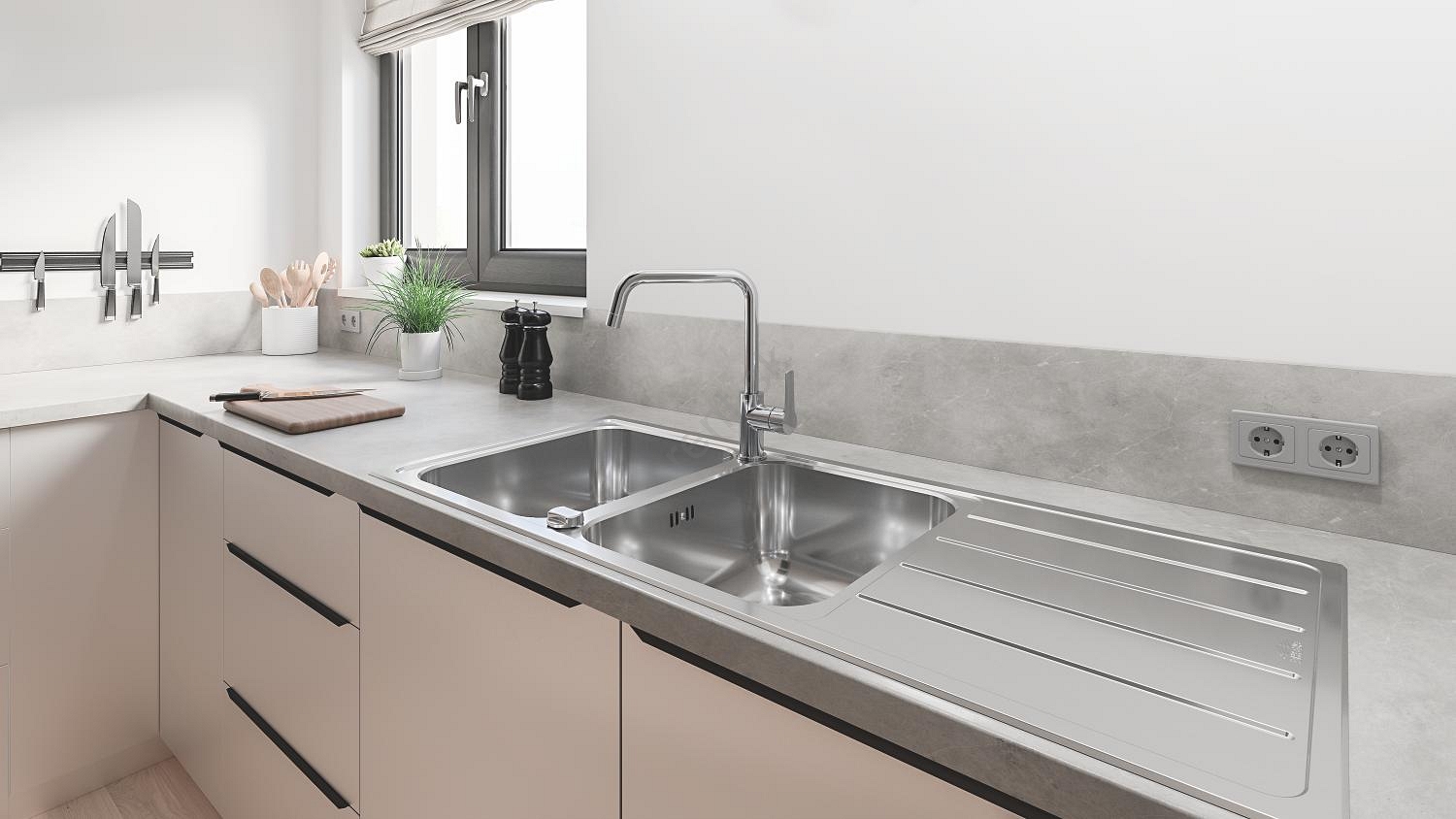 • Dvojitý nerezový drez s odkvapkávacou plochou pre maximálnu flexibilitu v kuchyni.