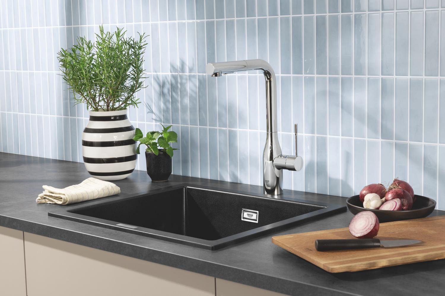 • Kompozitný drez GROHE K700 v elegantnom prevedení Granite Black.