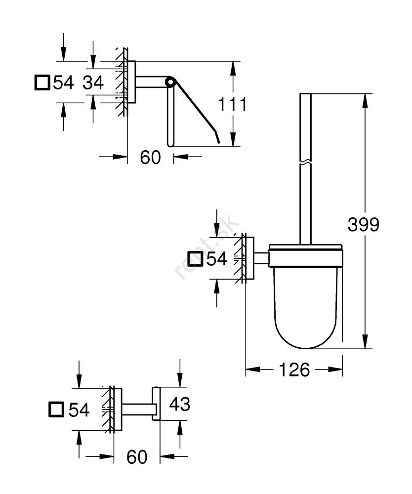 • Sada obsahuje háčik na župan, držiak toaletného papiera a WC kefu, všetko v jednotnom dizajne.