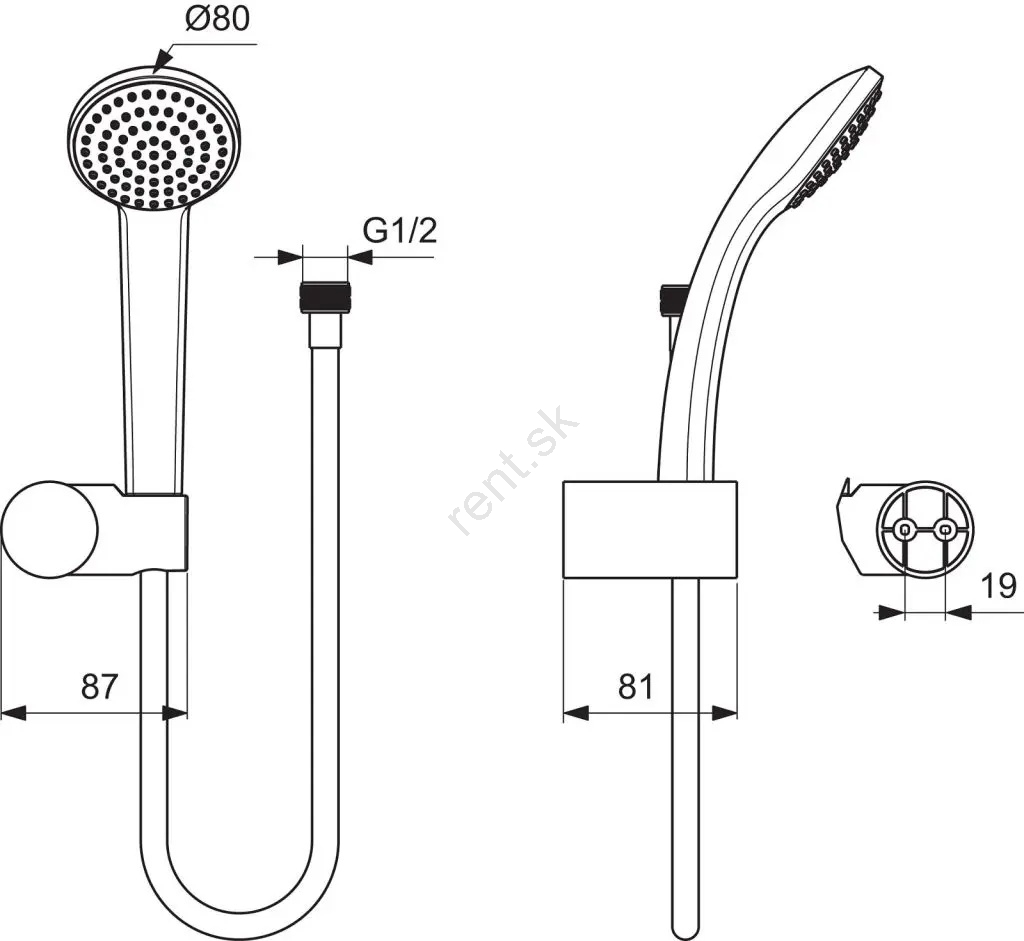 • Skladá sa z ručnej sprchy s priemerom 80 mm, sprchovej hadice a sprchového držiaka.