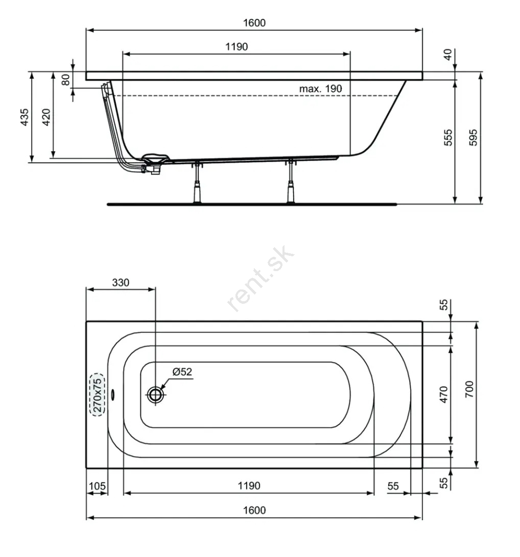 • Rozmery vane sú 1600 x 700 mm s hĺbkou 435 mm a celkovým objemom 191 l.