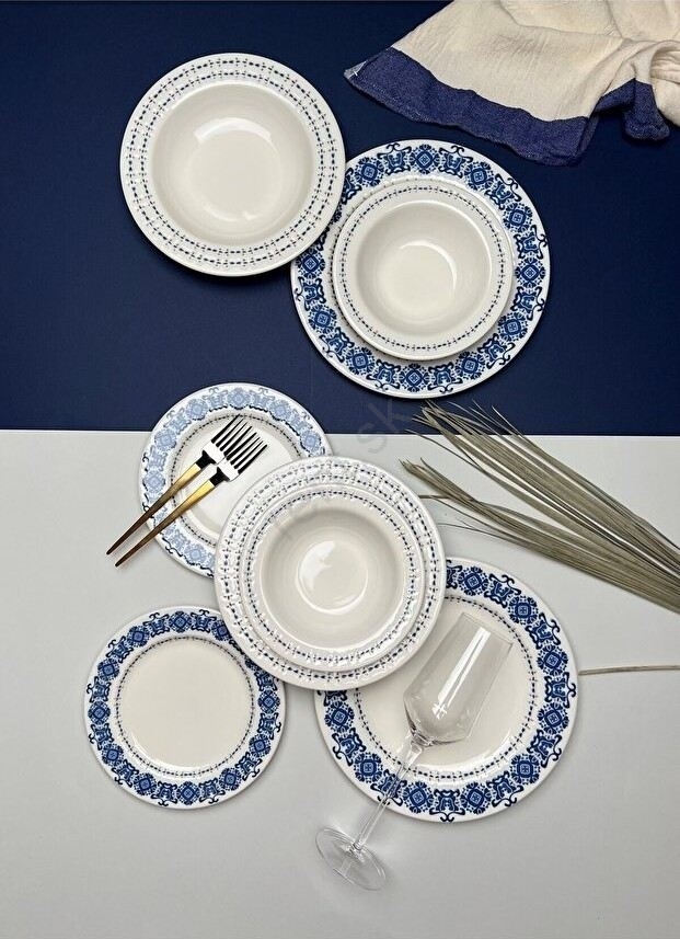 Jedálenská sada 16 ks, modrá/biela, porcelán