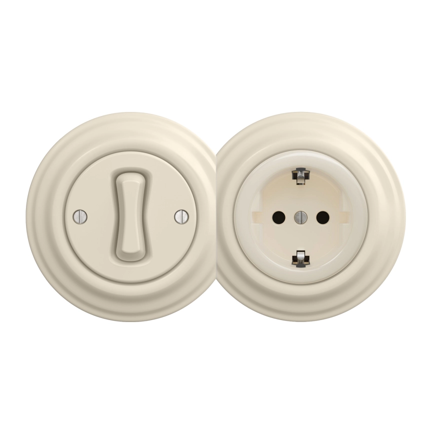 Kliklap - Retro jednopólový vypínač č. 1 a zásuvka SCHUKO 230 V s rámčekom v béžovom prevedení