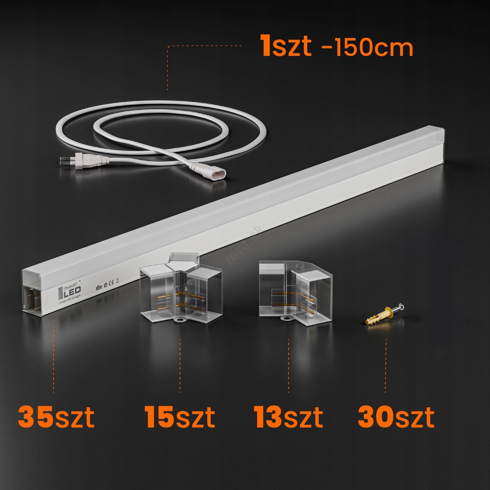 • Obsah balenia: napájací kábel (150 cm), 35 LED panelov, 15 trojitých konektorov, 13 uholových spojok, 30 hmoždiniek + skrutiek, montážne príslušenstvo (plastové očká alebo kovové konzoly podľa výberu).