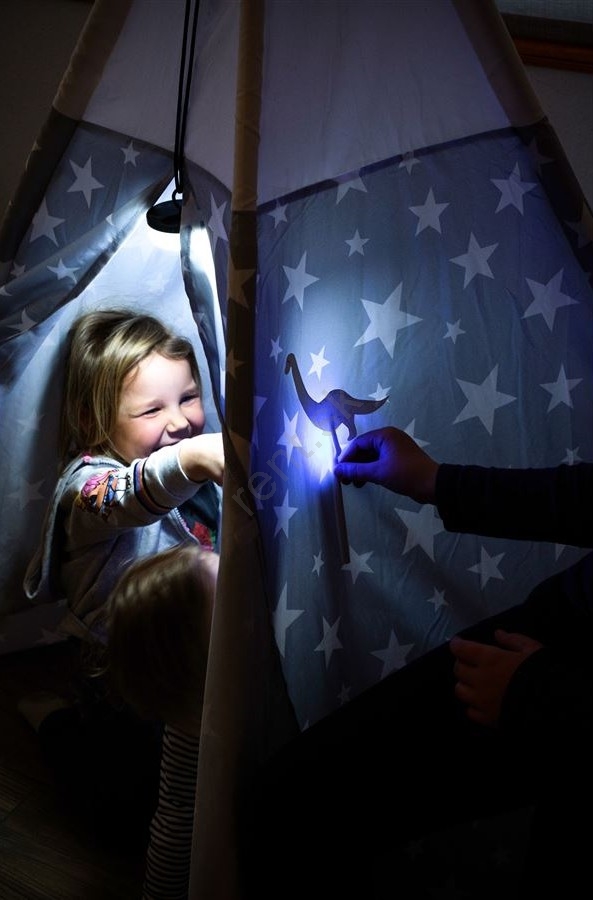 Ponúka štyri farby svetla – bielu, červenú, zelenú a modrú – a tiež režim blikania, ktorý rozžiari každú detskú oslavu či večernú hru.