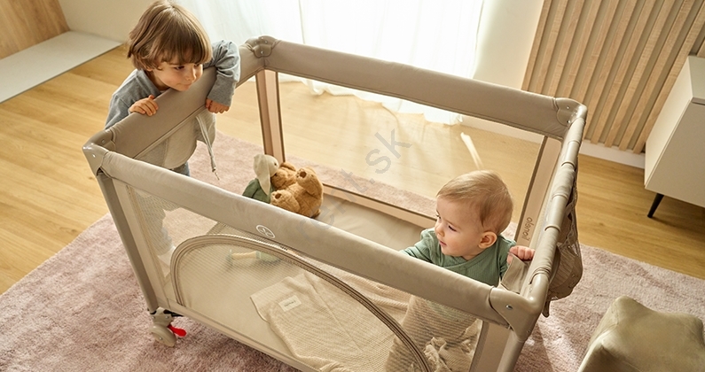 • Skladacia cestovná postieľka, ktorú možno použiť aj ako ohrádku.
