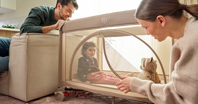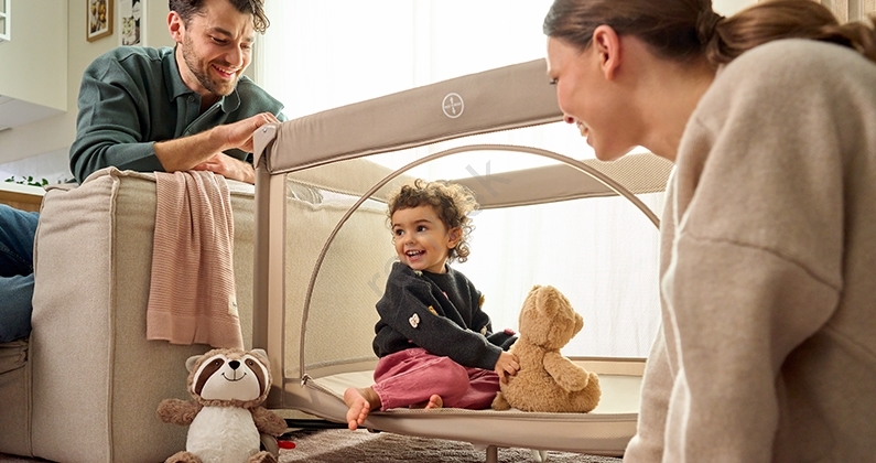 • Kompaktné rozmery po zložení a pribalená prepravná taška s rukoväťami zaručujú, že postieľku si môžete vziať vždy so sebou.