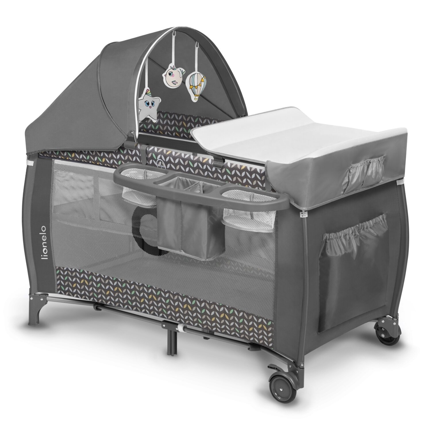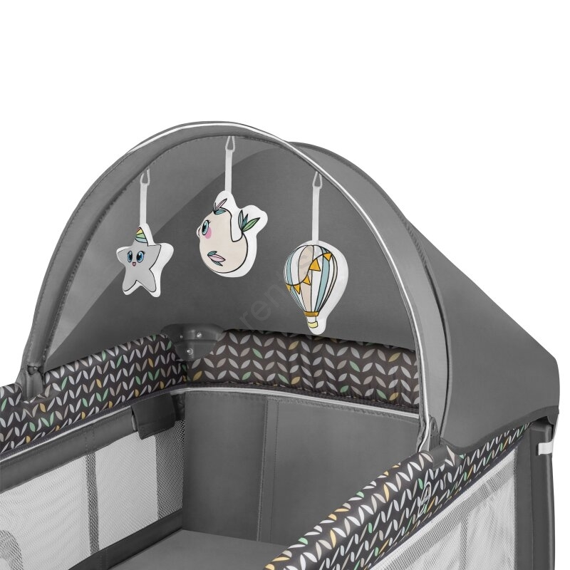 • Súčasťou balenia: prebaľovací pult s bočnými vreckami (na plienky, púder a pod.), košík na príslušenstvo s dvoma priehradkami, veľká moskytiera, strieška a hrazdička s plyšovými hračkami.