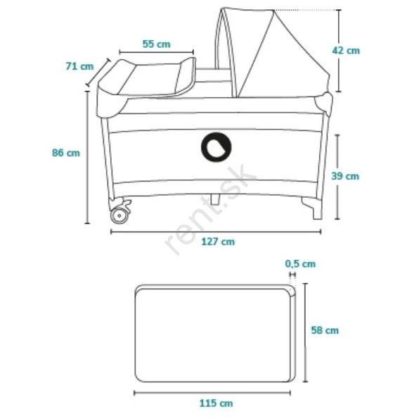 • Súčasťou je cestovný skladací matrac, ktorý možno použiť aj vo vloženom lôžku (rozmer 120x60 cm), vložené lôžko je tiež súčasťou balenia.