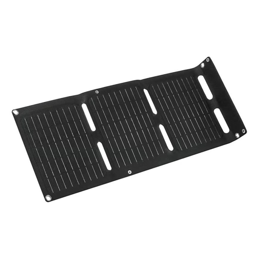 • Je vybavený monokryštalickými solárnymi panelmi v robustnom vodeodolnom puzdre (IP65) a poskytuje až 20 W bezplatnej solárnej energie, ktorá je ideálna na nabíjanie telefónov, tabletov a notebookov cez porty USB-C a USB-A (5 V, 2,4 A).
