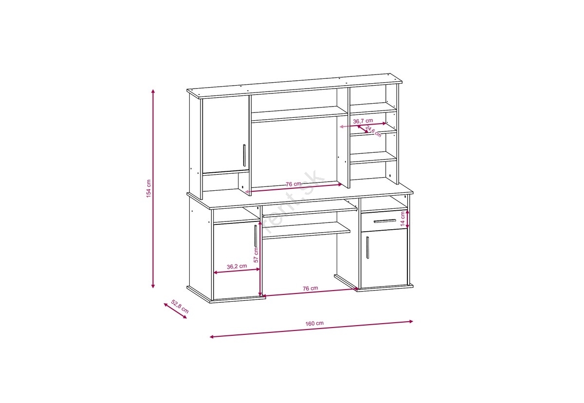• Ponúka priestrannú pracovnú dosku, vysúvaciu priehradku na klávesnicu a viacero úložných priestorov, vrátane uzavretých skríň, otvorených políc a vertikálnych priehradok.