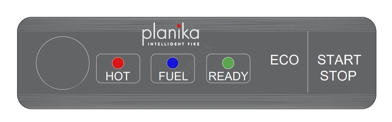 • Kontrolný panel umožňuje ručné zapnutie a vypnutie krbu, prepnutie do ECO režimu a zároveň signalizuje, kedy je palivová nádrž prázdna, kedy je krb pripravený na zapnutie a kedy je prehriaty.