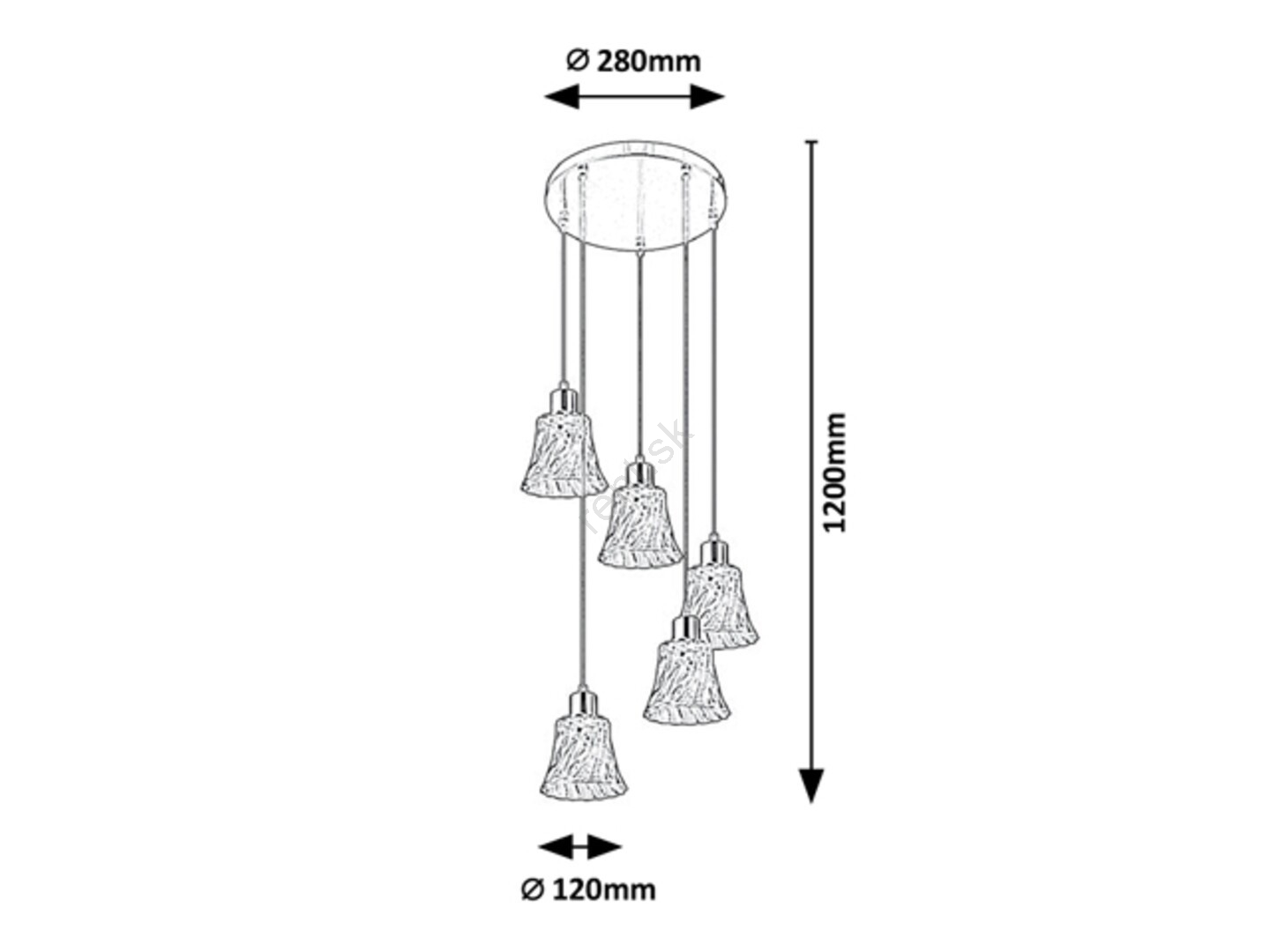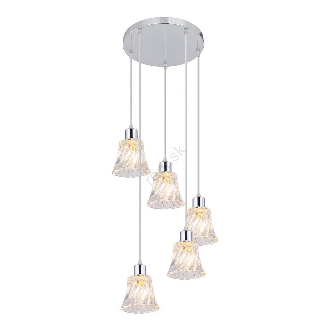 Závesné svietidlo Hestia s 5 žiarovkami v klasickom štýle bude elegantným doplnkom vo vašej obývačke, jedálni alebo možno v spálni. Chrómové kovové svietidlo je doplnené priehľadnými sklenenými tienidlami. Svietidlo je možné pripevniť na strop pomocou veľkého okrúhleho ozdobného podstavca. Zaujímavosťou zvonových tienidiel visiace v rôznych výškach je skrútený efekt ich zvlneného povrchu. Toto závesné svietidlo je vďaka svojej veľkosti vynikajúce aj na osvetlenie priestrannejšej miestnosti. Svietidlo Hestia môže byť použité s piatimi žiarovkami, každá s výkonom až 40W. Typ pätice je E14. Ak chcete vylepšiť intímnu a útulnú atmosféru, vyberte si pre toto svietidlo teplé biele svetelné zdroje. Rozmery závesného svietidla Hestia s 5 žiarovkami sú nasledovné: priemer každého tienidla je 120 mm, celkový priemer svietidla je 280 mm, vzdialenosť od stropu 1 200 mm. Tento model sa dodáva bez svetelných zdrojov.