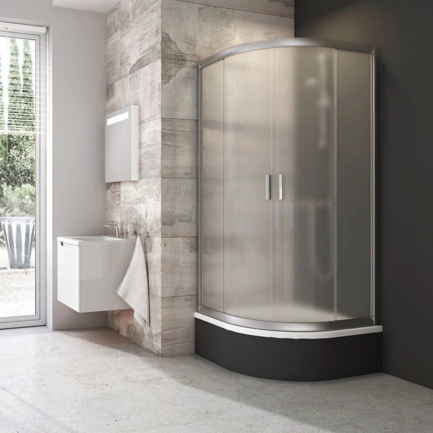 Štvordielny štvrťkruhový sprchovací kút Blix v elegantnom prevedení s výplňou z nepriehľadného plastu s dekorom Grape je spoľahlivým riešením pre každodenné sprchovanie.