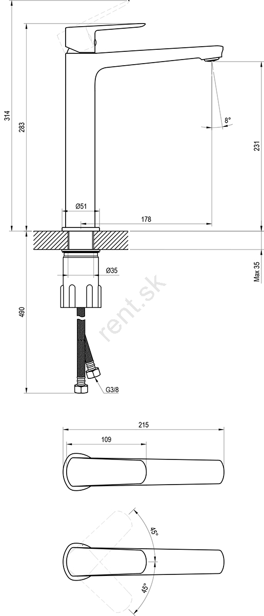 • Batéria sa dodáva bez výpuste a obsahuje flexibilné pripojovacie hadičky dĺžky 450 mm s prípojkou G3/8.
