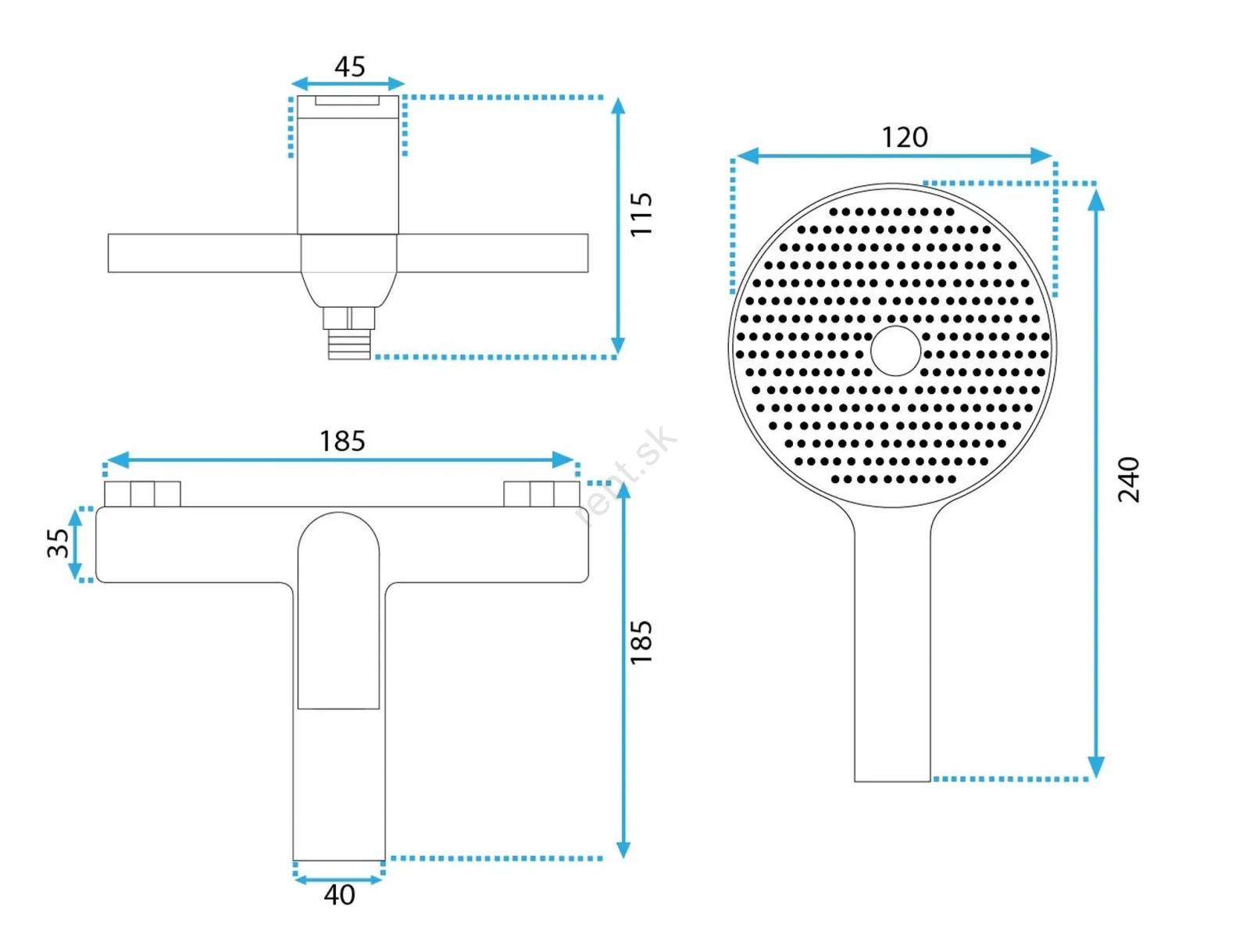 • Sada obsahuje: vaňovú batériu, ručnú sprchu, sprchovú hadicu (120 mm), držiak ručnej sprchy.