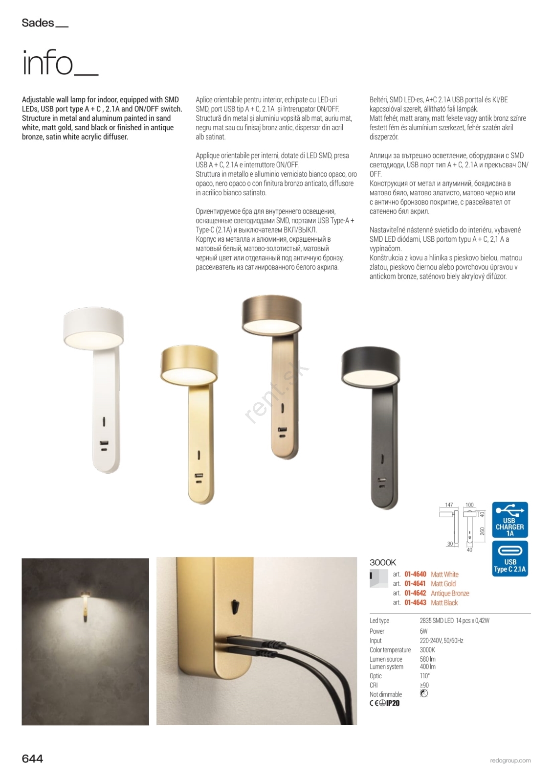 • Redo 01-4641 - LED nástenné svietidlo SADES LED/6W/230V CRI 90 USB zlatá