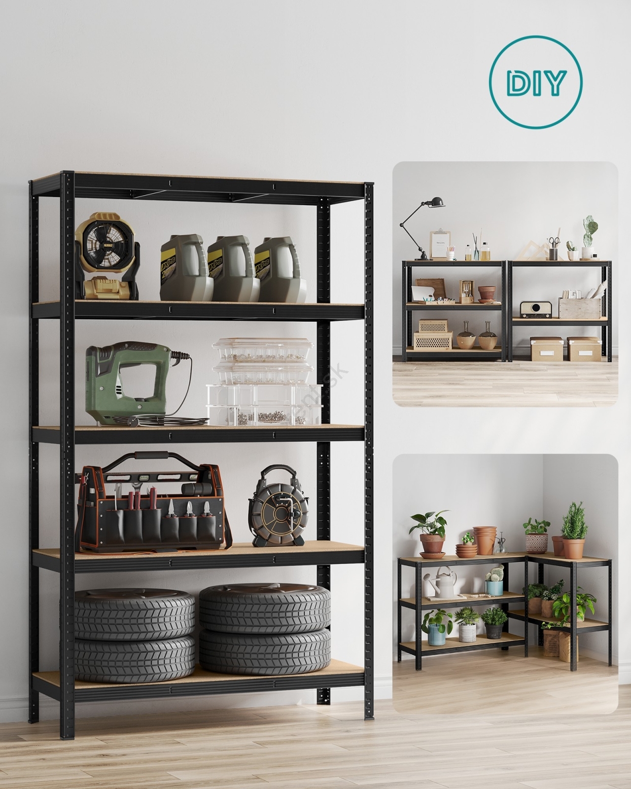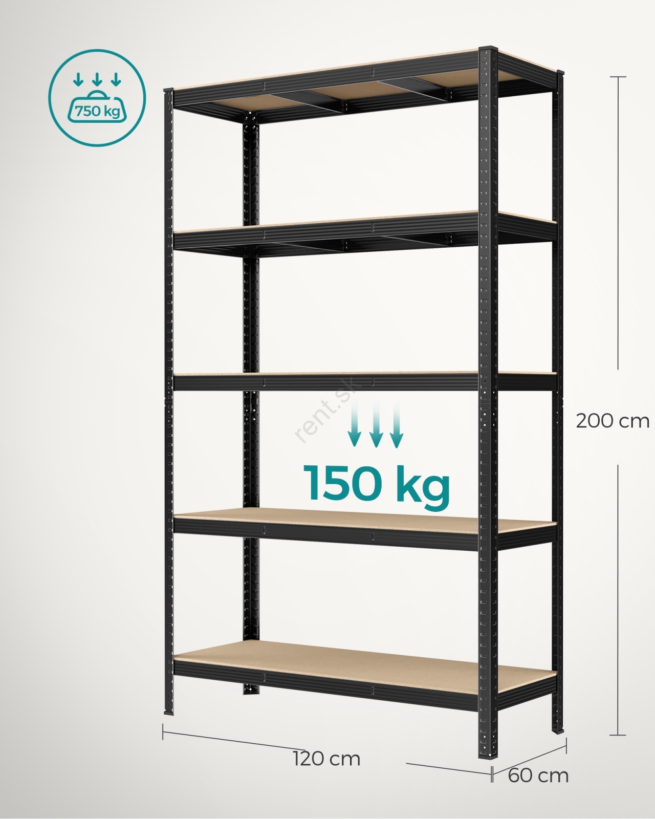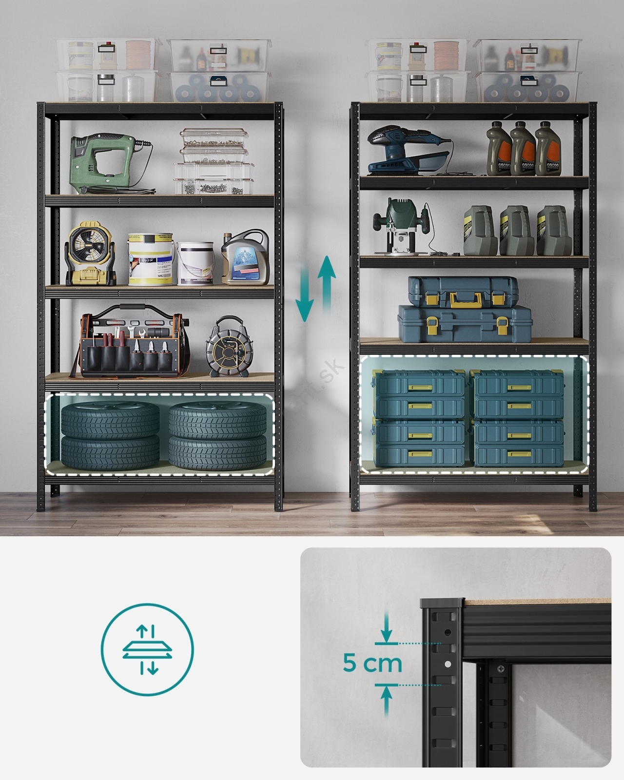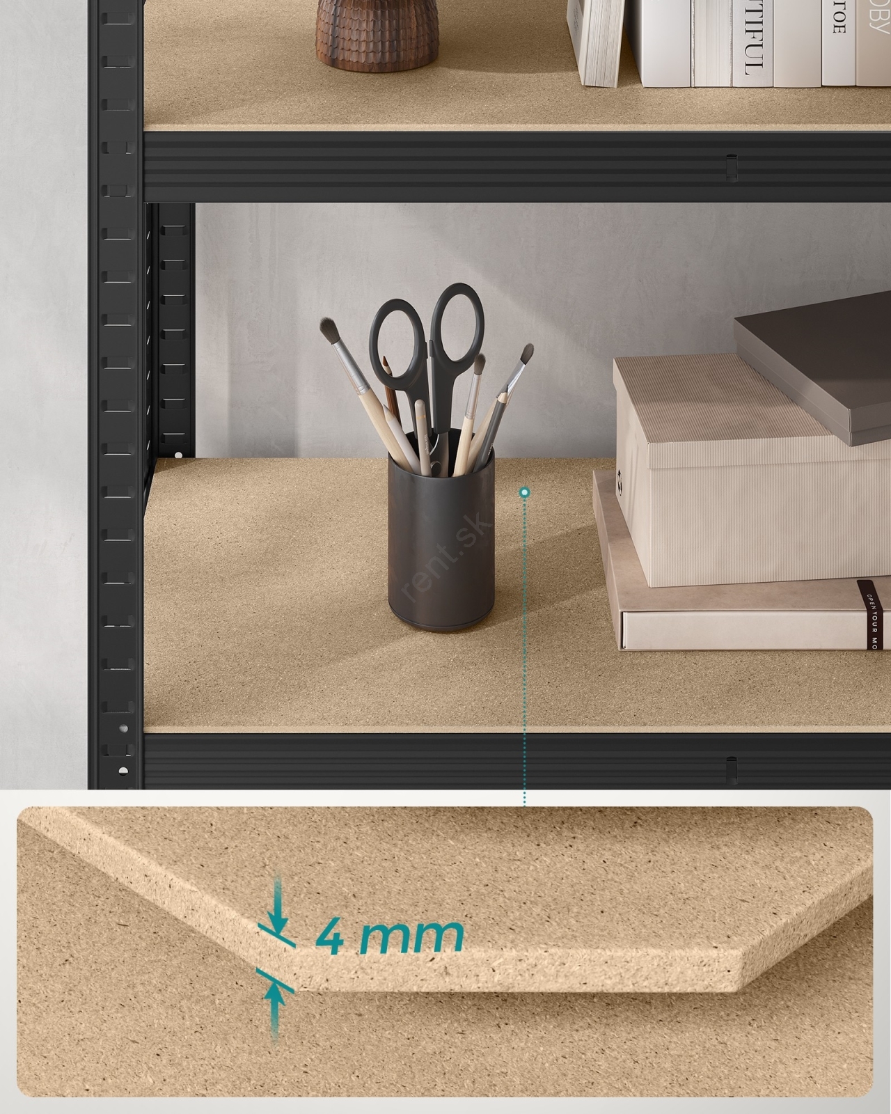 • Každá polica unesie až 150 kg a bezpečne pojme farby, náradie a fitness vybavenie.
