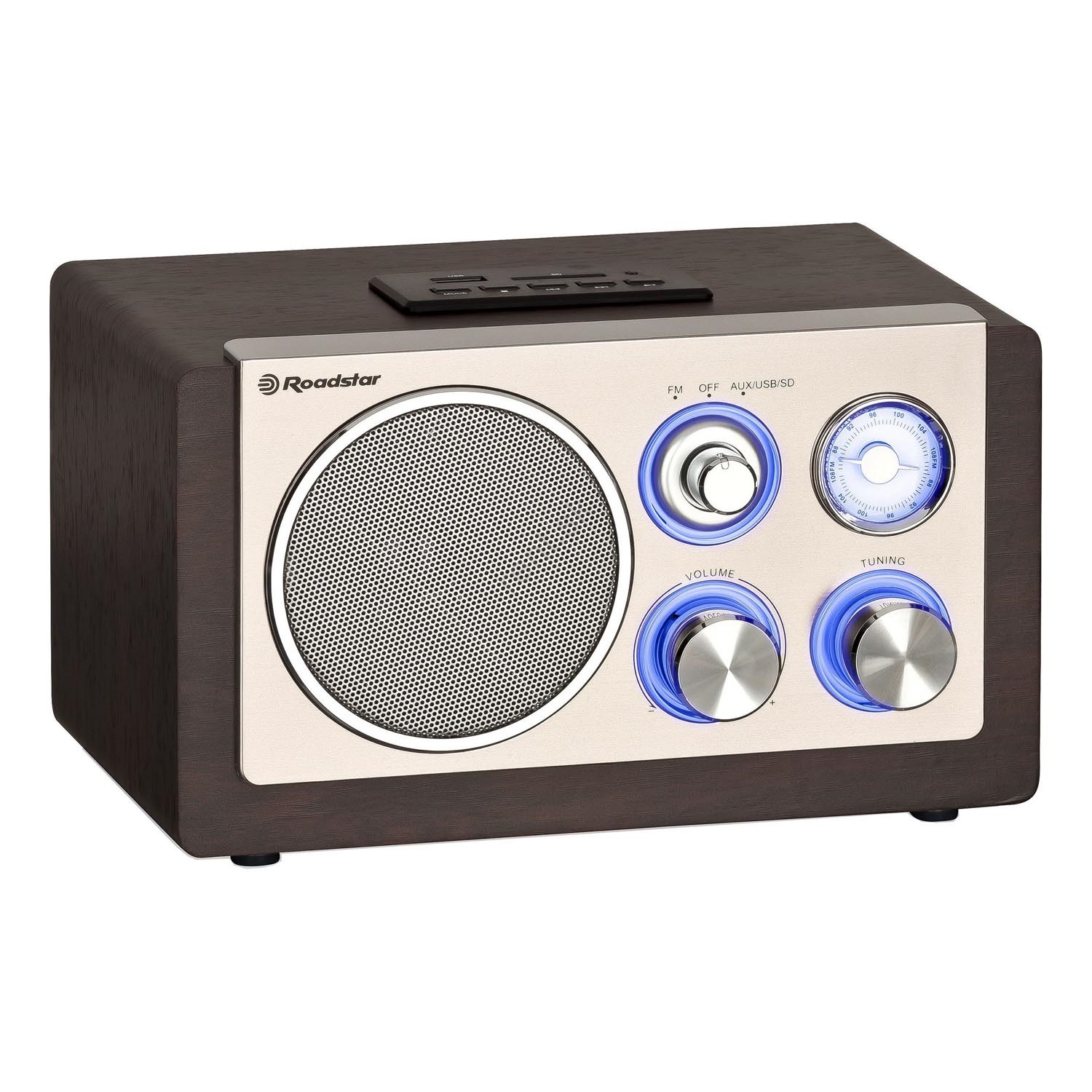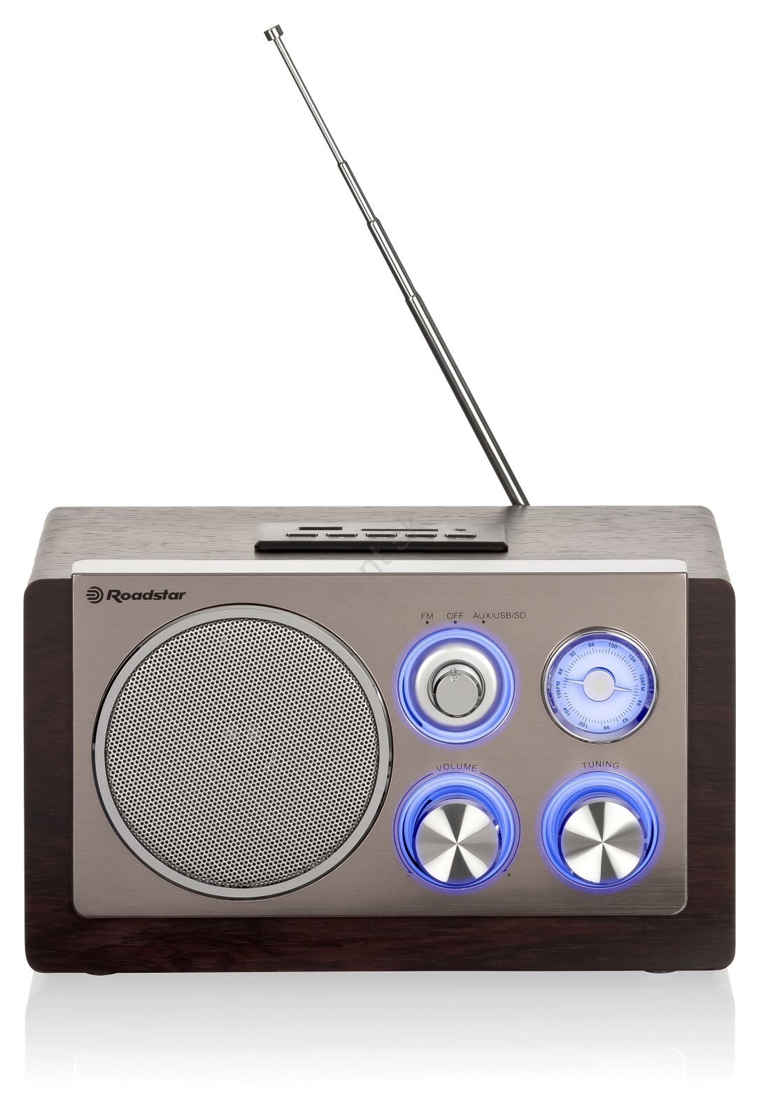 • Analógový FM tuner s ručným ladením a modro podsvietenou stupnicou.