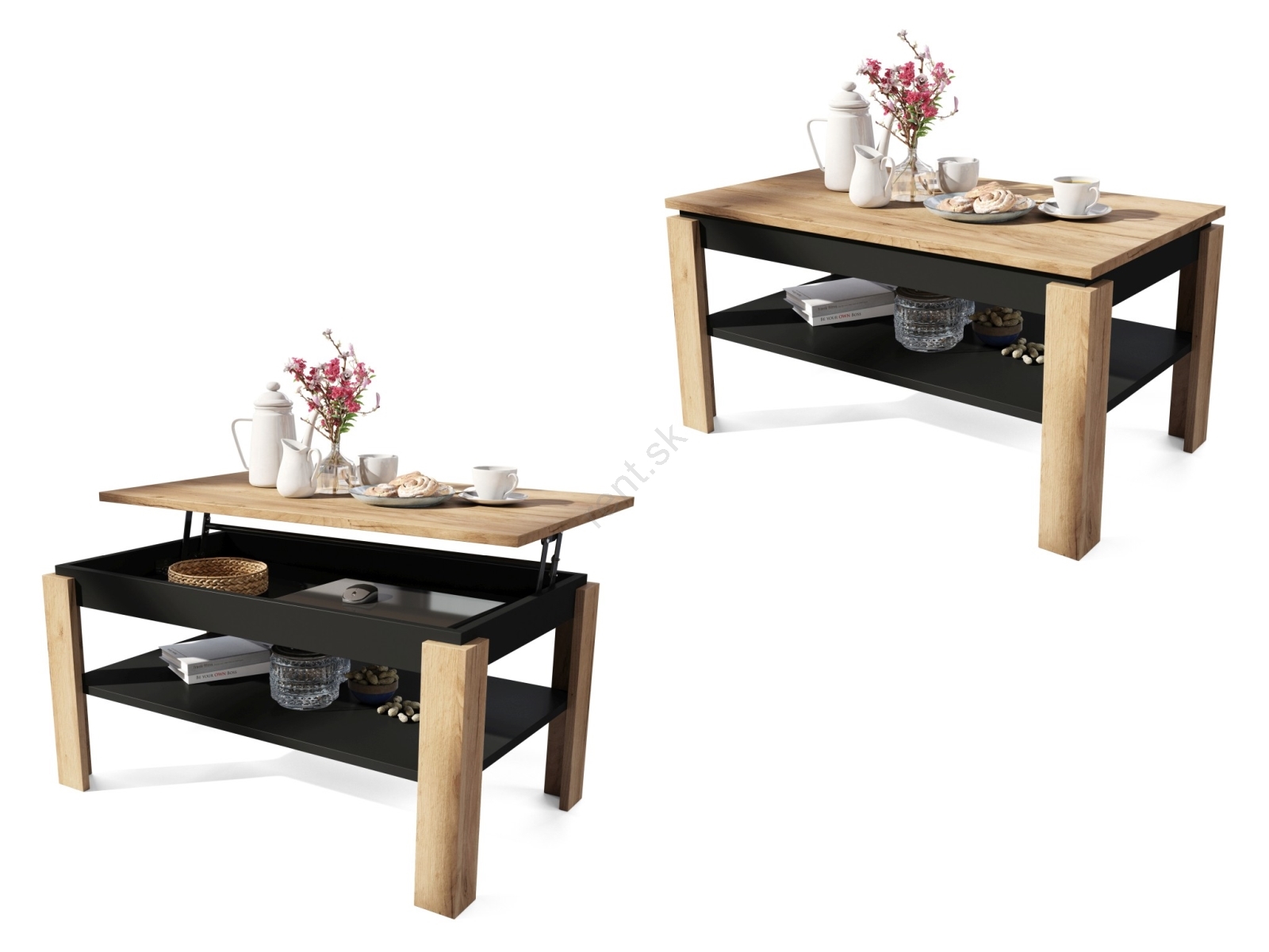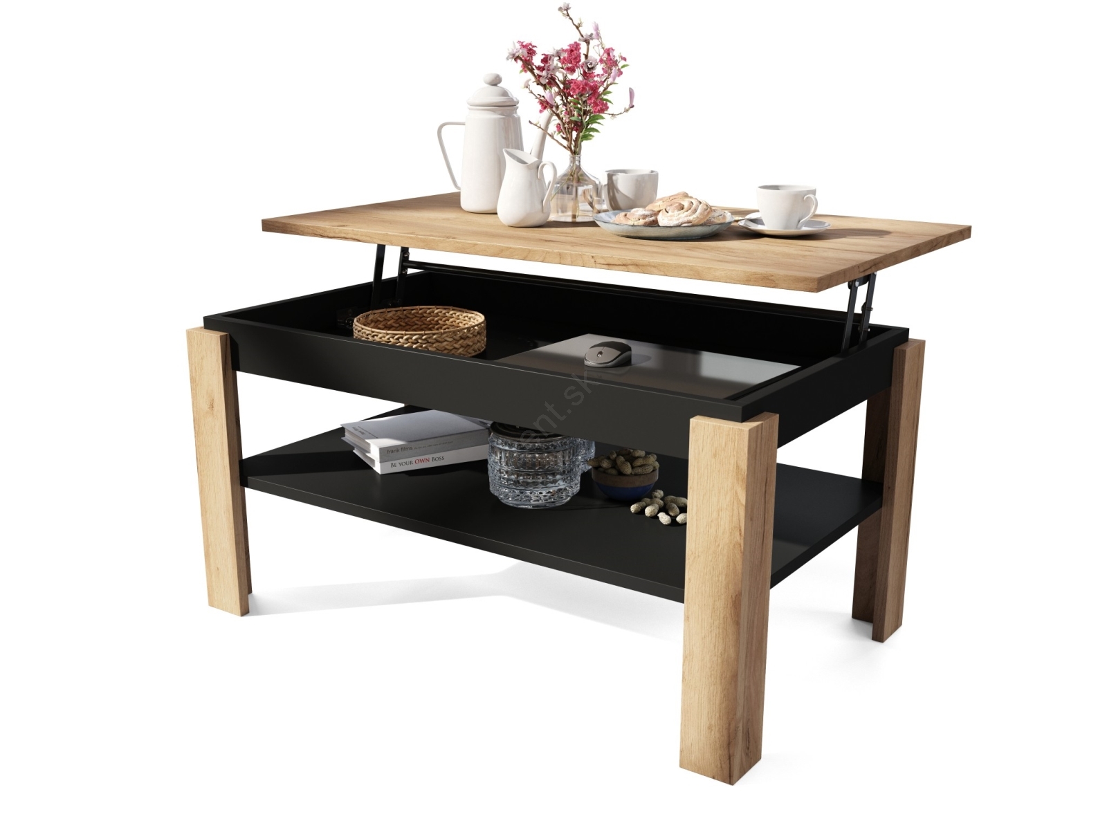 • Rozkladací konferenčný stolík so zdvíhacou doskou a policou ADEN dub craft/čierna