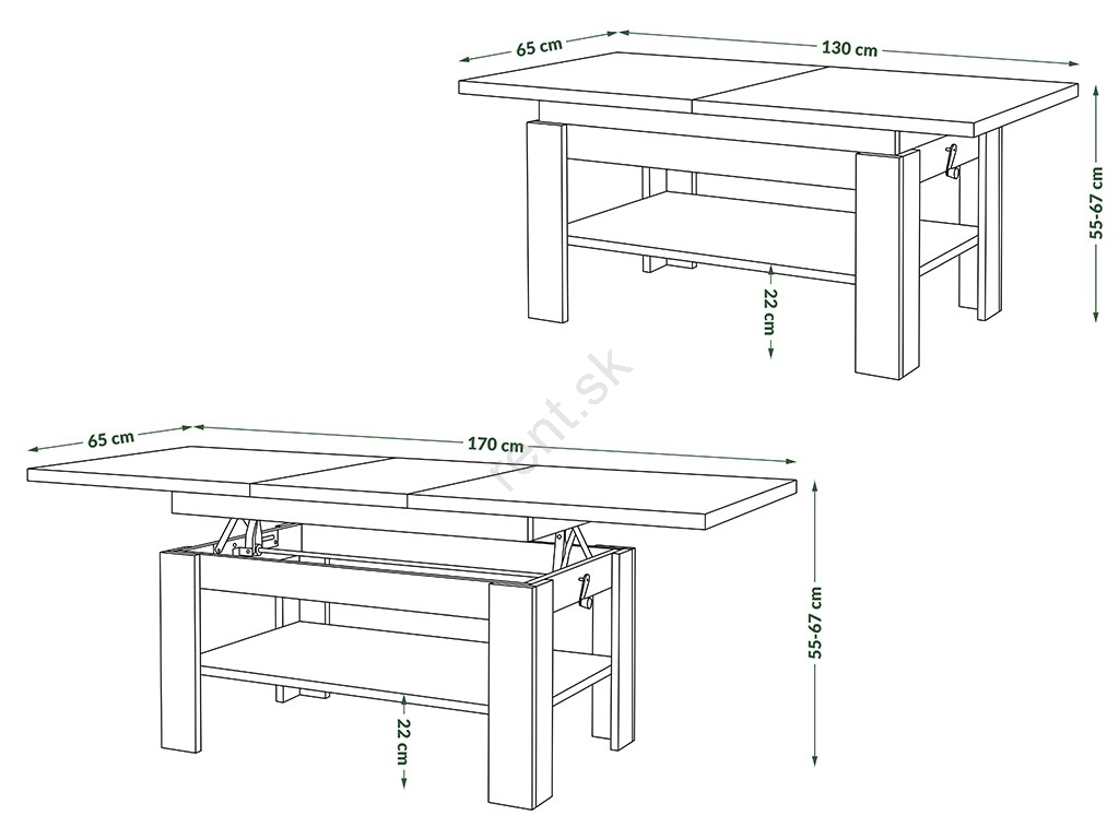 • Rozmery rozloženého stola: 170x65 cm.