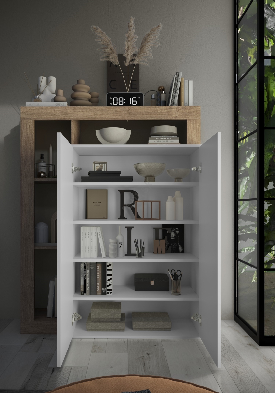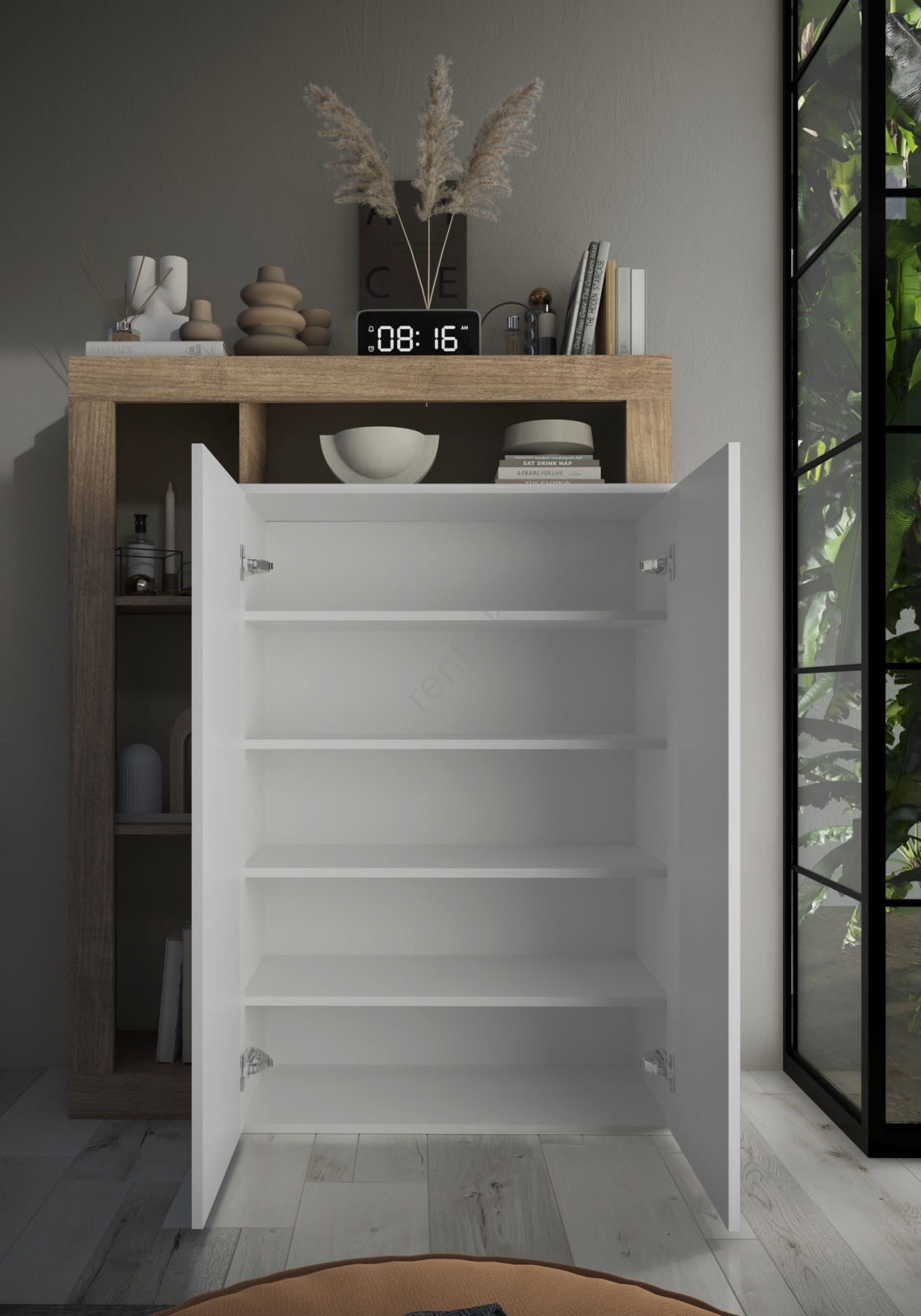 • Disponuje 4 otvorenými policami a 5 vnútornými priehradkami na uloženie tašiek, topánok a sezónnych vecí.