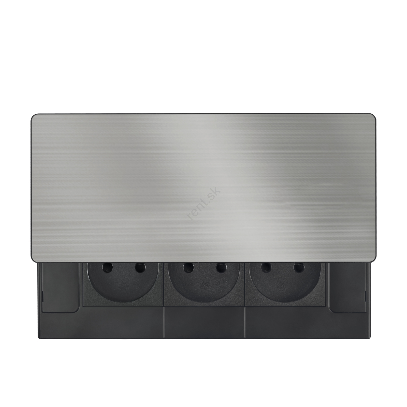 • Vrchný kryt je z matného tmavého nerezu (inox) a má posuvný mechanizmus, ktorý chráni zásuvky pred prachom a nečistotami.