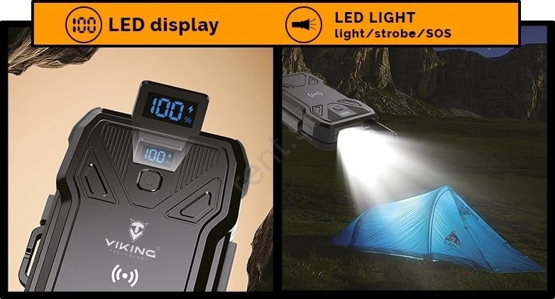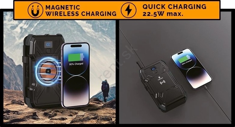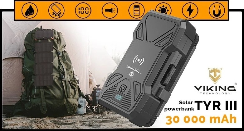 Powerbanka s kapacitou 30 000 mAh, s funkciou solárneho a bezdrôtového nabíjania a so zabudovaným LED svietidlom.