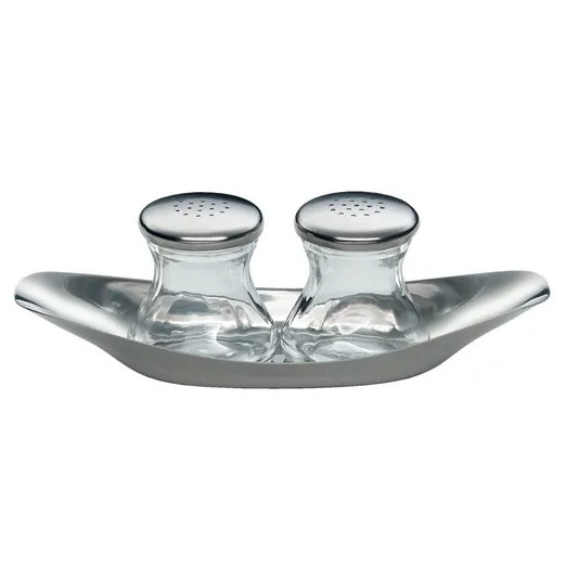 • Trojdielna sada obsahujúca soľničku, koreničku a elegantný servírovací podnos.